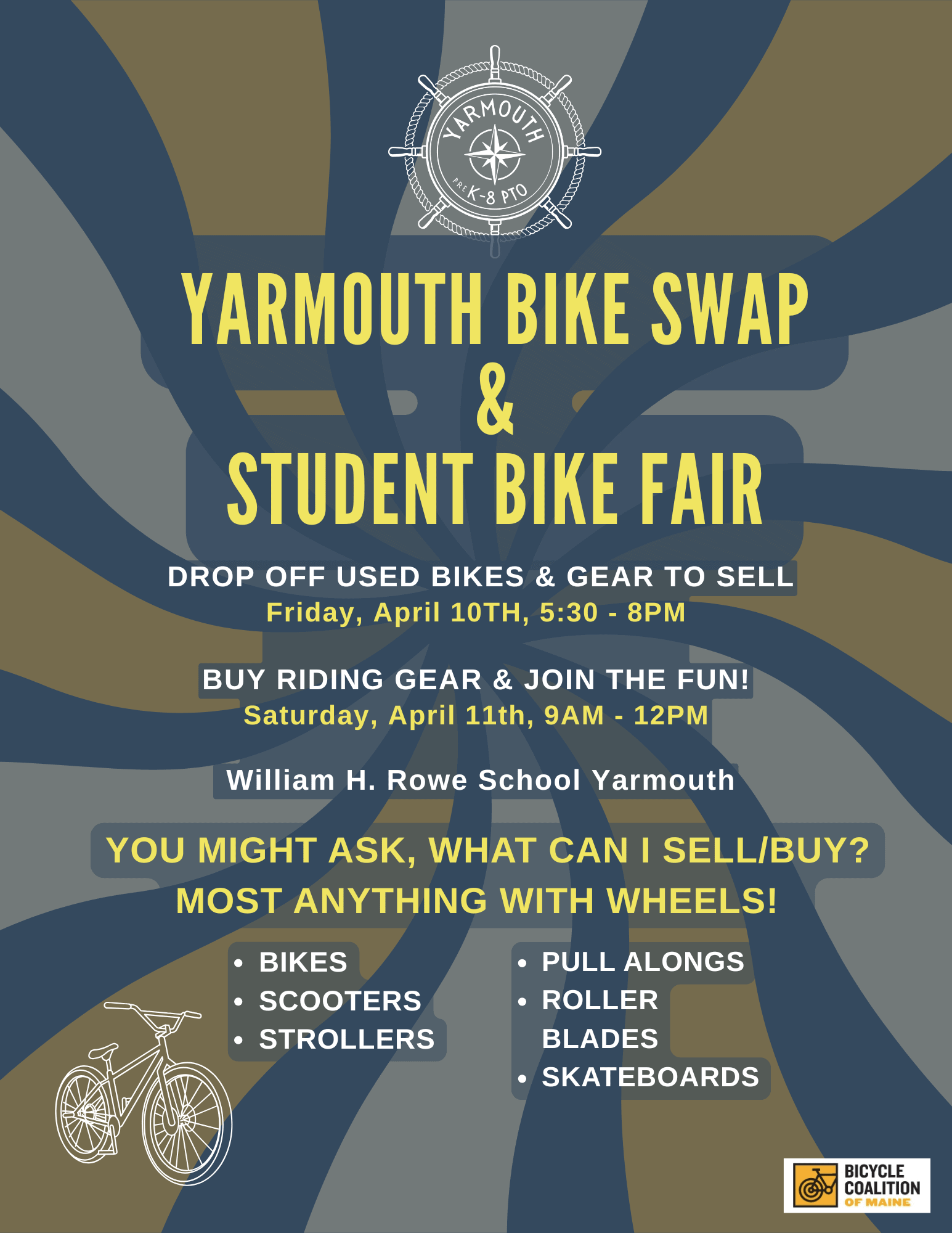 William H Rowe School 52 School St, Yarmouth, ME, United StatesGet ready for warmer weather and update your riding gear! The annual Yarmouth Bike Swap and Student Safety Fair will be held on Saturday, April 11th from 9-12. Interested in […]